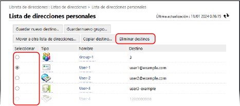 Iniciar la IU remotaLas listas de direcciones en las que se pueden editar y eliminar destinos varían en función del usuario que haya iniciado sesión.