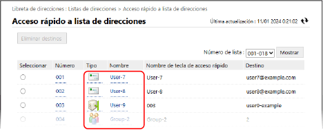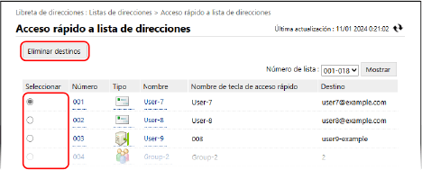 Se asignan números de tres dígitos (de 001 a 200) a botones de acceso rápido. En la parte superior derecha de la pantalla, seleccione el intervalo de números en [Número de lista] y haga clic en [Mostrar] para cambiar los números visualizados en la lista.
