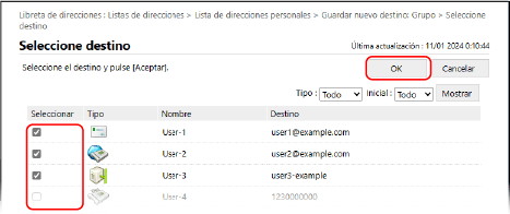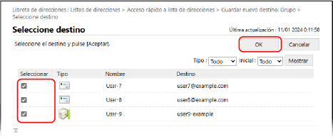 Seleccione las casillas de verificación de los destinos a registrar en el grupo y haga clic en [Bien].