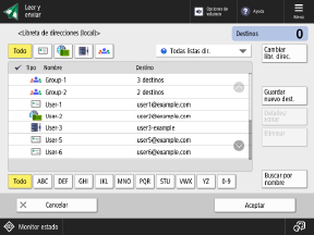 Al acceder a la Libreta de direcciones desde la pantalla de escaneado o fax, aparece la pantalla aplicable que se muestra a continuación.