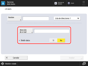 Si selecciona [Sí], los datos se dividen en tamaños más pequeños que no superan el límite y se envían en varias partes. El software de correo electrónico del destinatario debe poder combinar los datos divididos.
