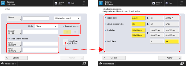 Establezca las condiciones de destino según las especificaciones del equipo de destino. Si establece condiciones que no admite el equipo de destino, se puede producir un error.