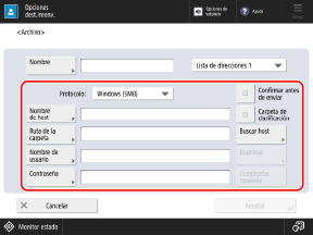 Al registrar una carpeta compartida, servidor de archivos o destino de Espacio avanzado en la Libreta de direcciones o en un botón de acceso rápido, configure los elementos descritos a continuación.
