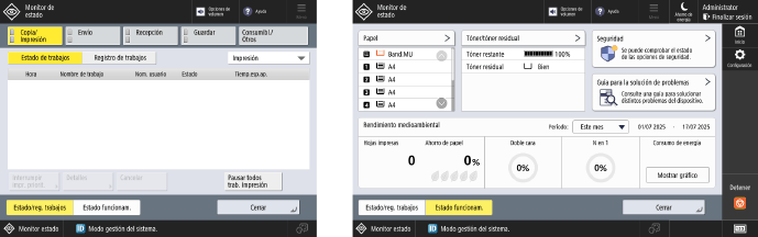 Puede seleccionar [Estado/registro de trabajos] para consultar el estado de procesamiento y el historial de cada función y la cantidad restante de consumibles y piezas.