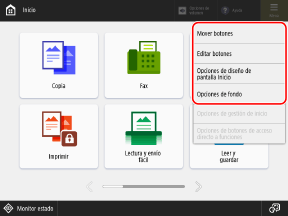 Puede reorganizar los botones de funciones y botones en la pantalla [Inicio] y cambiar el fondo de cualquiera de las imágenes predefinidas.