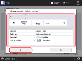 Para pedir al usuario que introduzca una contraseña cada vez, seleccione [No]. Únicamente los usuarios que conozcan la contraseña pueden utilizar las opciones recuperadas.