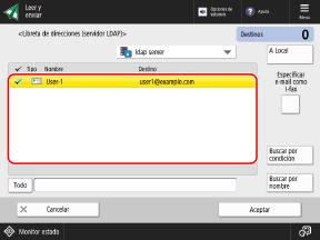 Cuando se gestiona la información de usuario con un servidor LDAP, puede buscar esa información y especificar destinos desde la pantalla de lectura (Leer y enviar) o de fax del panel de control.