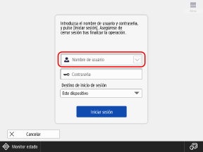 Pantalla [Inicio]La pantalla de inicio de sesión aparece automáticamente al ejecutar una función que requiera autenticación. Después de iniciar sesión, la pantalla cambia y puede continuar con las operaciones.
