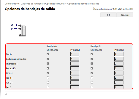 También puede especificar varias bandejas de salida para cada función y especificar la prioridad. En ese caso, cuando la bandeja de salida de máxima prioridad alcance su capacidad, el destino de salida cambia automáticamente a una bandeja de prioridad inferior.
