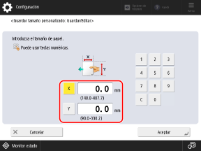 Puede registrar tamaños cuando use con frecuencia un papel de tamaño no estándar específico. Puede recuperar el tamaño en la pantalla de introducción del tamaño, de modo que se ahorra la molestia de tener que introducir el tamaño cada vez.