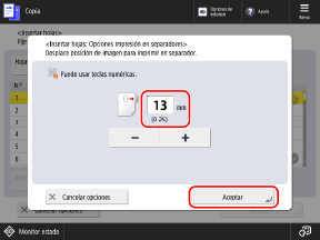Para insertar dos o más hojas de papel separador en la misma página, pulse el botón para seleccionarla, y especifique el número de hojas a insertar mediante el teclado numérico.