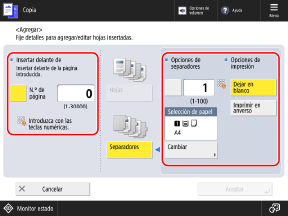 Pulse el botón [N.º de página] para seleccionarlo y especifique el número de página donde debe insertarse el papel, mediante el teclado numérico.