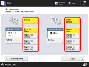 Si configura las opciones para insertar una hoja, página de capítulo o papel separador en la primera página al copiar, la portada saldrá como página en blanco, aunque configure las opciones para copiar en la portada.