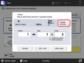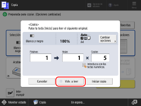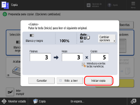 Antes de pulsar [Iniciar copia], vuelva a introducir el número de copias utilizando las teclas numéricas.