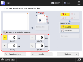 3, pulse [Entrada con teclas num.] y especifique el área mediante las teclas numéricas para introducir los valores de [X1] a [Y2], con la parte superior derecha del original como punto de referencia.