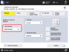 Pantalla de copiaAparece la pantalla [Filigrana de seguridad].