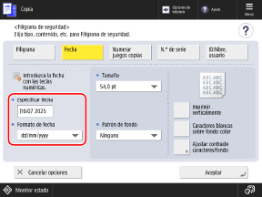 De forma predeterminada, se introduce la fecha establecida en el equipo. Si desea añadir una fecha distinta, introdúzcala mediante el teclado numérico.