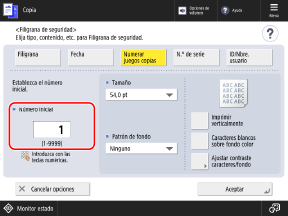 Puede incrustar números de juegos de copias (para indicar el orden de los juegos de copia). Se pueden utilizar como números de control para cada juego de copias.