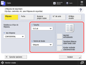 Las opciones configuradas en la pantalla [Filigrana de seguridad] se aplican al formato de caracteres de la impresión de muestra.