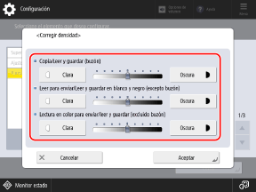 Si la densidad del color de los datos escaneados o del resultado de la impresión difiere significativamente de los datos de origen o del original, realice la corrección para que la densidad al escanear se aproxime más a la del original. Puede corregir la densidad para cada función.