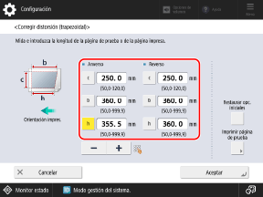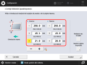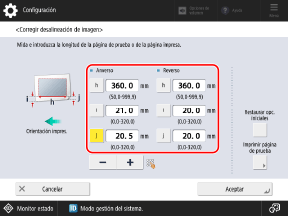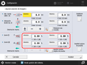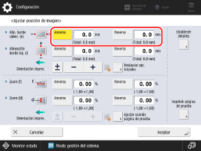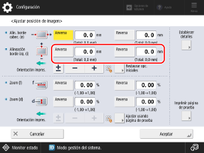 * Cuando visualice la pantalla [Ajustar posición de imagen] después de utilizar Ajustar alineación del borde izquierdo o Ajustar alineación del borde de cabecera, el valor de la pantalla se restablecerá a "0,0 mm", pero se conservará el valor establecido anteriormente. Si desea repetir el ajuste, compruebe el indicador de la página de prueba reimpresa y establezca ese valor.