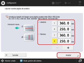 Pulse [Ajustar usando página de prueba], introduzca los valores medidos en [f] y [d], y pulse [Aceptar]