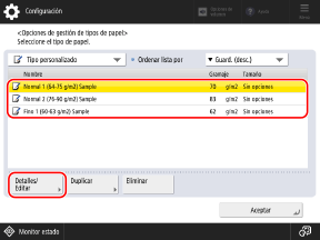 Pantalla [Detalles/Editar]Puede cambiar información como el gramaje básico y el tipo de papel, así como la calidad de la imagen y la posición de impresión según las características del papel.