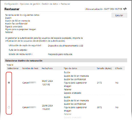 Si se incluyen datos del Espacio personal en el Espacio avanzado, los datos del Espacio personal no se restaurarán a menos que se guarde la misma información de usuario que la del origen de la copia de seguridad. En este caso, exporte la información de usuario del origen de la copia de seguridad, impórtela al equipo y, a continuación, realice la restauración.