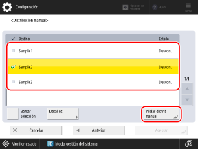 Marque las casillas de los destinos y pulse [Iniciar distrib manual].