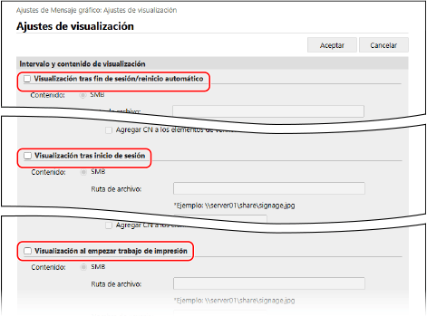 Para [Contenido] en cada opción de intervalo de visualización, seleccione el protocolo ([SMB] o [HTTP/WebDAV]) utilizado para acceder al contenido a visualizar, e introduzca la ruta al contenido.