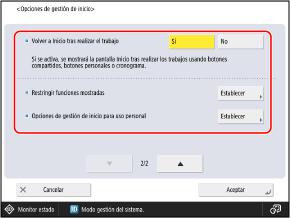 Para restringir los elementos que cada usuario puede personalizar en la pantalla de [Inicio], pulse [Establecer], seleccione [No] para cada elemento que desee restringir y, a continuación, pulse [Aceptar].