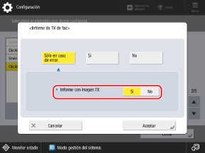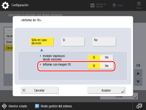 Para imprimir un informe solo cuando se produzca un error, seleccione [Sólo en caso de error]. En este caso, establezca [Permitir impresión desde opciones] en [Sí] cuando desee poder configurar si quiere imprimir el informe desde la pantalla de escaneado o de fax.