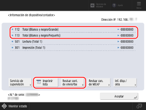 Puede comprobar el número de páginas impresas y copiadas consultando los elementos indicados por "Total" o "Copia" en la pantalla [Información de dispositivo/contador].