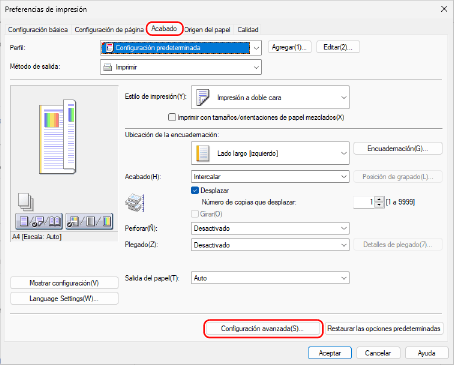 En la pestaña [Acabado], haga clic en [Configuración avanzada].