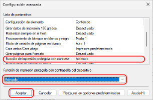 Haga clic en [Función de impresión protegida con contraseña del dispositivo], seleccione [Activado] y haga clic en [Aceptar].