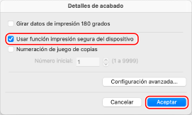 Marque la casilla [Usar función impresión segura del dispositivo] y haga clic en [Aceptar].
