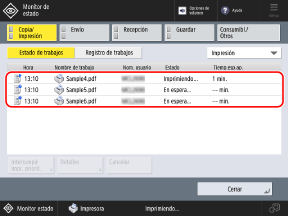 Al pulsar [Impresión prioritaria], el trabajo seleccionado se sitúa al principio de la cola de espera. El trabajo seleccionado se ejecuta una vez finalizado el trabajo anterior en curso.