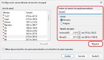 Introduzca el nombre del papel de tamaño personalizado y el tamaño del papel, y haga clic en [Registrar].