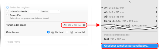 Para [Tamaño del papel], seleccione [Gestionar tamaños personalizados].