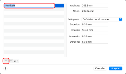 Haga clic en [+] en la parte inferior izquierda, haga clic en [Sin título] e introduzca el nombre del papel de tamaño personalizado.