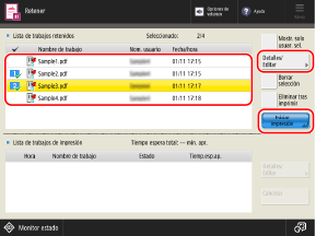 El documento retenido se puede imprimir tras revisar los detalles en el panel de control, o bien imprimir una muestra para comprobar el resultado de la impresión y evitar así impresiones no deseadas.