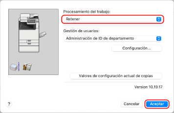 En [Procesamiento del trabajo], seleccione [Retener] y haga clic en [Aceptar].