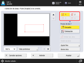 Para volver a especificar el rango, pulse [Borrar área] en la pantalla [Selección de áreas: Entrada con toque] y repita la operación desde el Paso