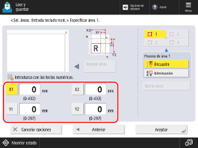 3, pulse [Entrada con teclas num.] y especifique el rango mediante las teclas numéricas para introducir los valores de [X1] a [Y2], con la parte superior derecha del original como punto de referencia.