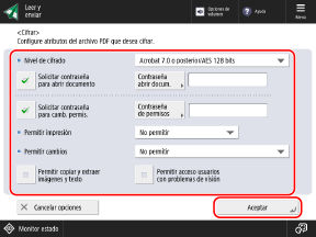 Para establecer una contraseña, seleccione la casilla, pulse [Contraseña para abrir docum.] e introduzca la contraseña.