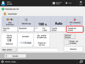 En la pantalla de escaneado, pulse el botón de configuración del formato de archivo.
