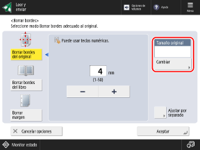 * Puede borrar las sombras de un libro solo si escanea los tamaños mostrados en la pantalla para seleccionar el tamaño del original.