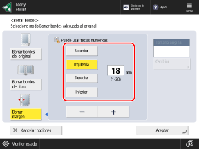 Al establecer un tamaño de original mayor que el del original real, o al escanear páginas de un libro grueso, pueden aparecer zonas oscuras y sombras en torno a los bordes del original. Puede configurar las opciones para borrar los bordes o sombras al escanear. También puede borrar perforaciones del original.