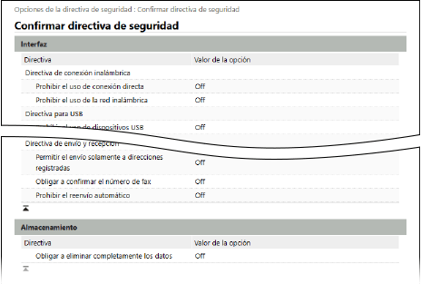 Puede configurar y comprobar los siguientes elementos en la pantalla [Opciones de la directiva de seguridad] o [Confirmar directiva de seguridad] de la IU remota.