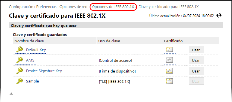 Aparece la pantalla [Clave y certificado para IEEE 802.1X].